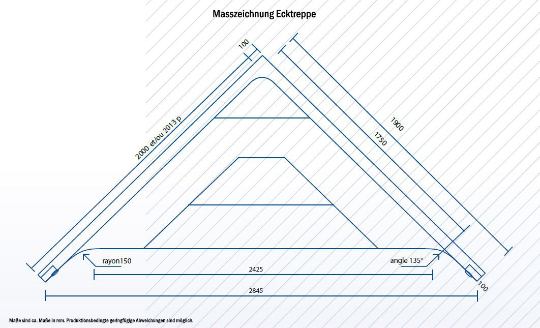Die Treppe ist in Farbe weiss,sand oder blau erhältlich. Die Ecktreppe ist 200x200x150cm groß.