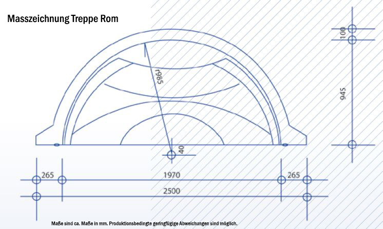 Die Treppe ist in Farbe weiss,sand oder blau erhältlich. Die Treppe Rom hat eine Breite von 250cm.